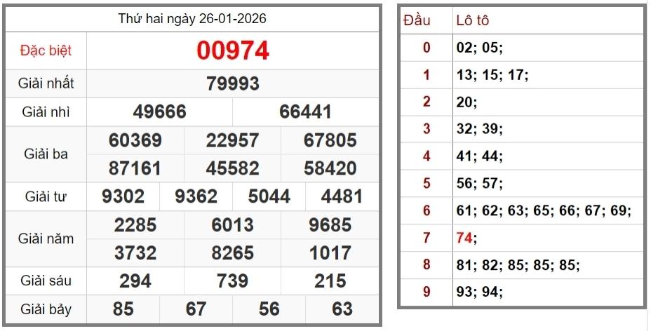 Kết quả xổ số miền Bắc 26-01-2026